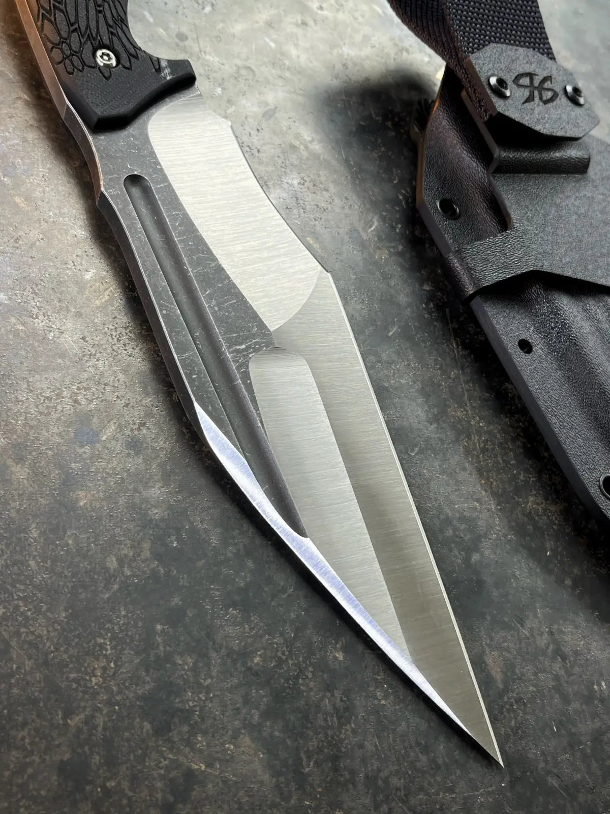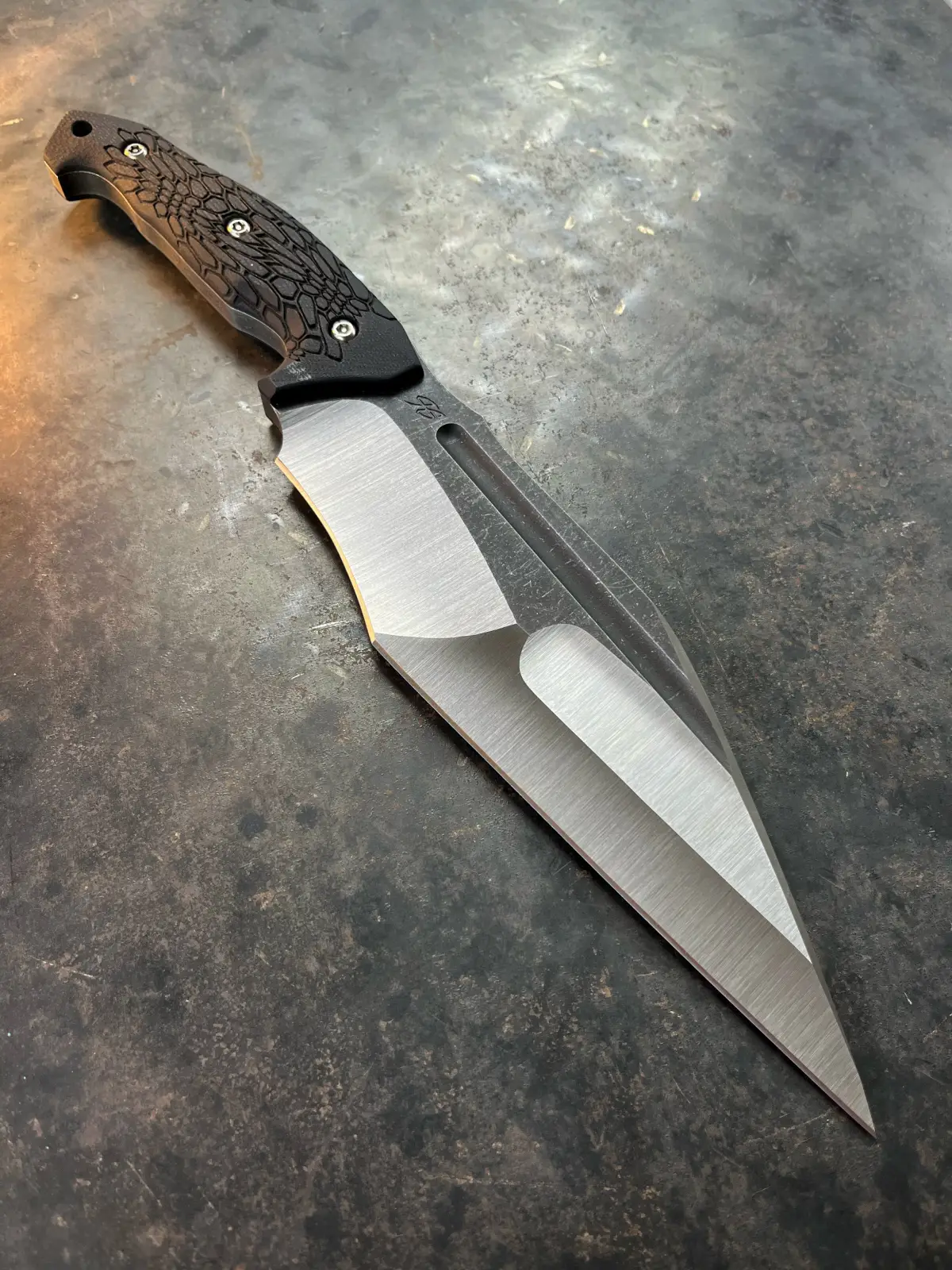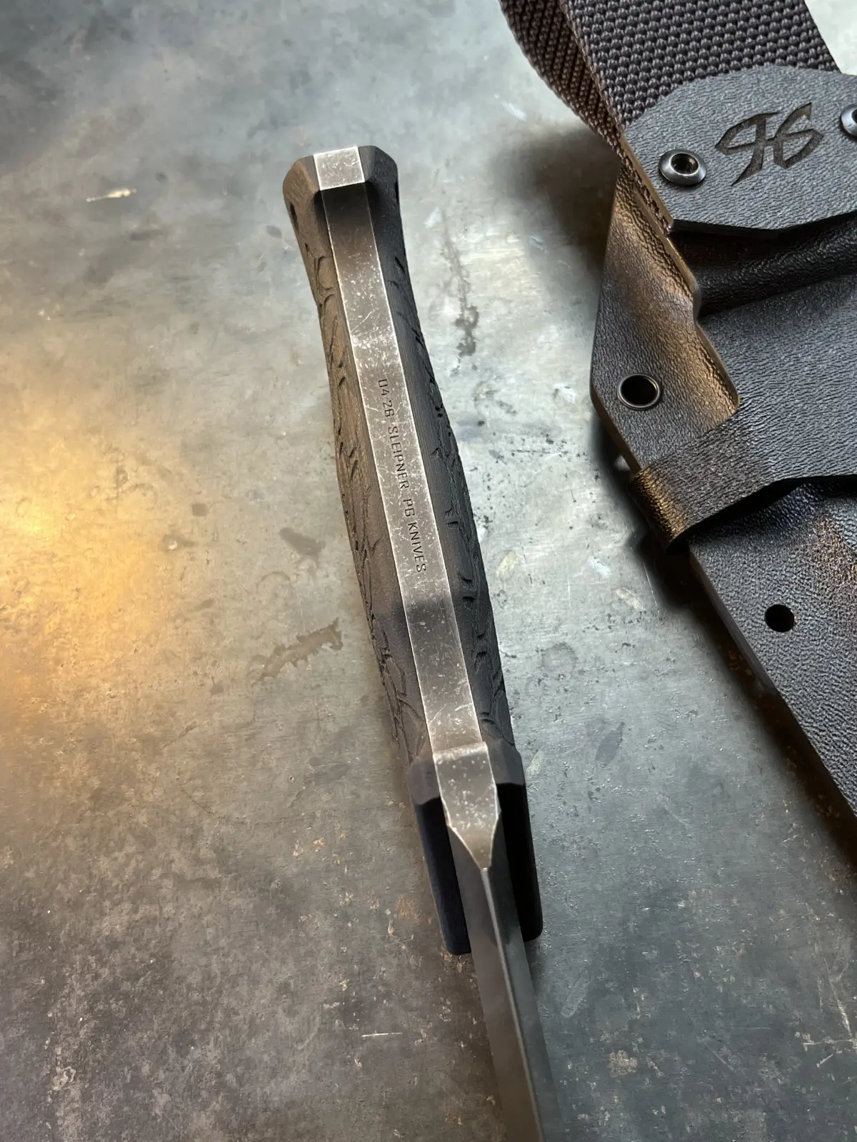 Many hours spent at the grinder grinding this beast. The 8mm Sleipner steel and the hollow grinds on both the front and rear sections, along with the fuller added to the front hollow grind using a 6-inch wheel, ensure that despite its thickness, the blade won’t bind and cuts very well even in the kitchen.