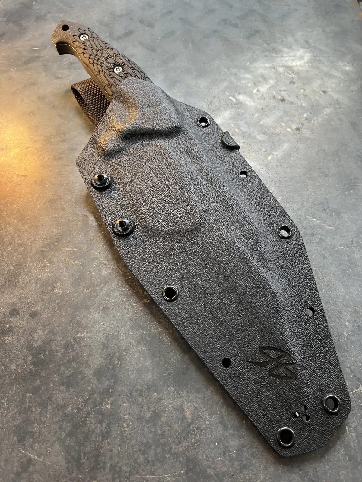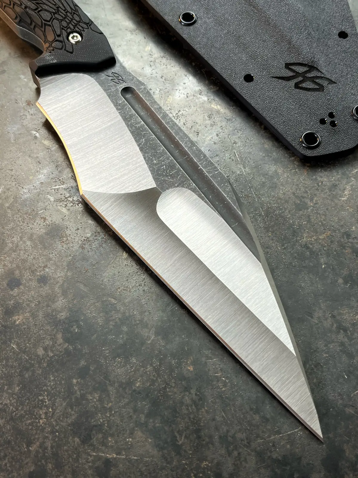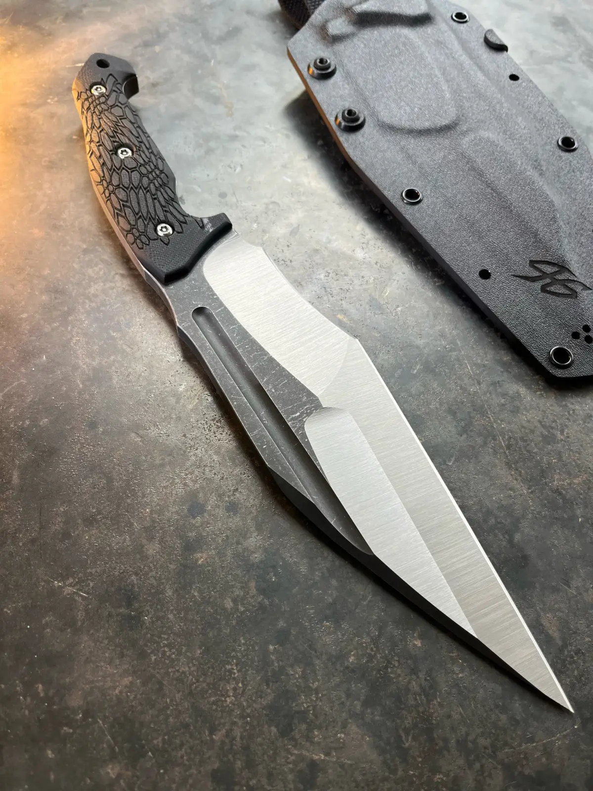 Many hours spent at the grinder grinding this beast. The 8mm Sleipner steel and the hollow grinds on both the front and rear sections, along with the fuller added to the front hollow grind using a 6-inch wheel, ensure that despite its thickness, the blade won’t bind and cuts very well even in the kitchen.